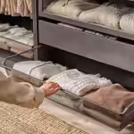 Стеклянная полка отлично подходит для красивой демонстрации аксессуаров в сочетании с подсветкой внутри гардероба ПАКС, а также для хранения вещей наверху — снизу видно содержимое.
