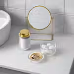 В этом стеклянном контейнере удобно хранить косметические диски для снятия макияжа, ватные шарики и украшения, а его стильная крышка может заменить мыльницу.