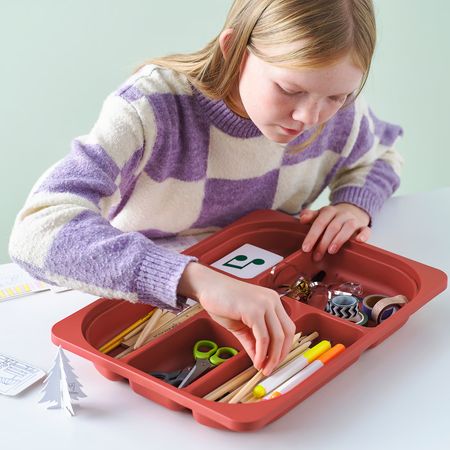 В этом лотке с отделениями ребёнок может хранить ручки, бусины, шнуры и другие вещи.