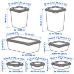 В набор входит: 4 контейнера (9x 9x 4 см, 150 мл), 3 контейнера (12x 8x 4 см, 150 мл), 2 контейнера (12x 12x 4 см, 300 мл), 2 контейнера (12x 12x 14 см, 1 л), 2 контейнера (14x 14x 6 см, 600 мл), 2 контейнера (14x 14x 16 см, 1,6 л) и 2 контейнера (23x 16x 8 см, 1,8 л).