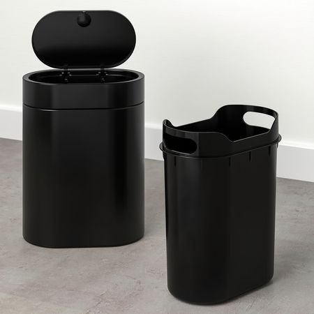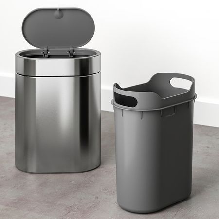 Открывается легким нажатием на крышку.Легко поддерживать в чистоте, так как на поверхности не видны отпечатки пальцев.Компактные размеры — легко поместится даже в небольшом пространстве.Контейнер можно поставить на пол или повесить на стену.