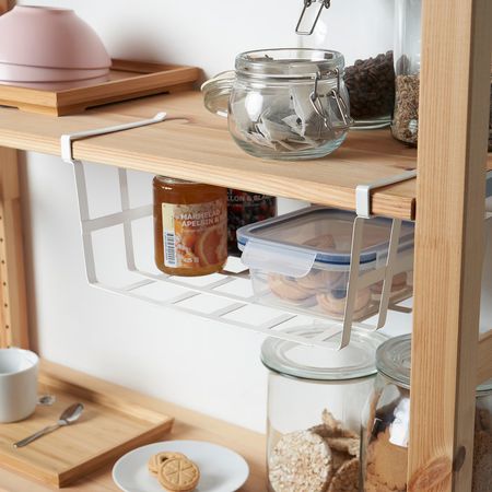 Эта подвесная корзина станет удобным решением для хранения кружек или банок в кухонном шкафу или под полкой.