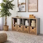 Эта корзина ручной работы с красивым рисунком плетения, через которое видно, что хранится внутри, будет прекрасно смотреться где угодно и подходит по размеру для полок стеллажа КАЛЛАКС.