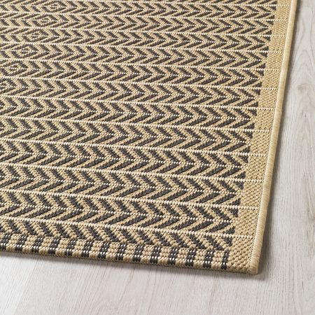 Этот безворсовый ковёр мягких бежевых и светло-коричневых оттенков смотрится естественно и создаёт тёплую и уютную атмосферу как в помещении, так и на балконе или в другом пространстве на свежем воздухе.