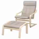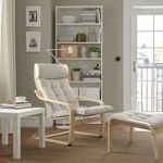 Кресло POÄNG со стильным каркасом из гнутой древесины обеспечивает поддержку шеи, а удобный табурет для ног позволяет отдыхать с комфортом.