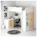 Эта кровать-чердак обеспечивает комплексное решение для детской комнаты – включая письменный стол, гардероб и стеллаж. Вы можете установить стол параллельно или перпендикулярно кровати, а также поставить отдельно, дополнив двумя ножками АДИЛЬС.