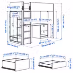 В эту компактную комбинацию входит чердак-кровать, письменный стол с выдвижными ящиками, гардероб с выдвижным ящиком и книжная полка.