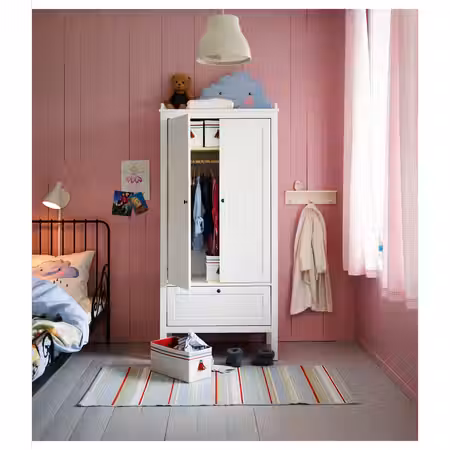 Стеклянная полка отлично подходит для красивой демонстрации аксессуаров в сочетании с подсветкой внутри гардероба ПАКС, а также для хранения вещей наверху — снизу видно содержимое.