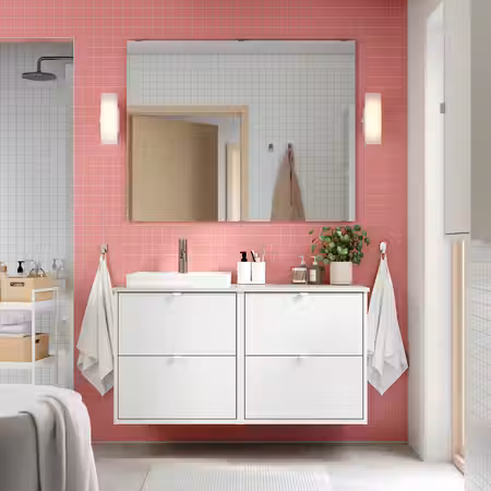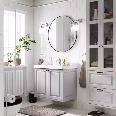 Мебель для ванной ЭНГШЁН выглядит современно и лаконично с минимумом деталей.