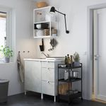 Серия ЭНХЕТ — это комбинации мебели даже для маленькой кухни или домашней прачечной. Ширина этого решения — всего 110 см, но в нем много места на открытых полках и за глухими фасадами, и есть все необходимое.