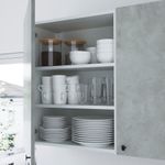Навесной шкаф с дверцей дает возможность эффективно использовать место над столешницей. Идеальный вариант для хранения стеклянной и столовой посуды — в шкафу все будет защищено от пыли.