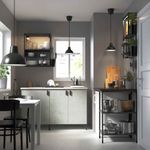 Серия ЭНХЕТ — это комбинации мебели даже для маленькой кухни или домашней прачечной. Ширина этого решения — всего 150 см, но в нем много места на открытых полках и за глухими фасадами, и есть все необходимое.