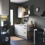 Серия ЭНХЕТ позволяет создавать комбинации мебели, чтобы начать в кухне новую жизнь. В этом компактном и рационально организованном решении есть место на открытых полках и за глухими фасадами, а также удобная столешница.