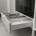 В нижнем ящике напольного шкафа для духовки предусмотрено дополнительное пространство для хранения сковород, противней и разделочных досок.