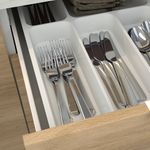 Внутренние элементы — лотки для столовых приборов и кухонных принадлежностей, держатели для тарелок — помогут вам организовать хранение и более эффективно использовать пространство шкафов, продаются отдельно.
