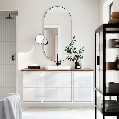 Это решение с несколькими ящиками позволит удобно организовать хранение, а открытое пространство между шкафами под раковину идеально подходит для табурета или мусорного ведра.