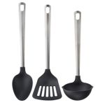 Не повреждает антипригарное покрытие кастрюль и сковородок.В набор входит: ложка 33 см, половник 32 см, лопаточка 33 см.Вымойте изделие перед первым использованием. Нержавеющая сталь, Армированная полиамидная пластмасса