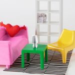 Журнальный столик ЛАКК, диван КЛИППАН, кресло ИКЕА ПС ВОГЭ, подушка-сердце ФАМНИГ ЙЭРТА, ковер СТОКГОЛЬМ и стеллаж ЭКСПЕДИТ — миниатюрные копии бестселлеров ИКЕА для обустройства кукольного домика.