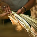 Абажур из плетеного бамбука создает декоративные узоры света и тени на стене.