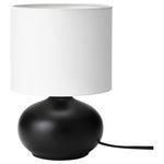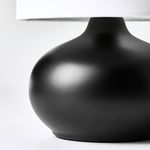 Небольшая настольная лампа в классическом черно-белом исполнении с основанием из керамогранита, увенчанная текстильным абажуром, сквозь который струится мягкий рассеянный свет.