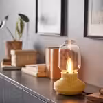 Она мягко освещает комнату теплым атмосферным светом, а лампочка с регулируемой яркостью, которая видна сквозь прозрачный абажур, выглядит почти как живое пламя.