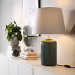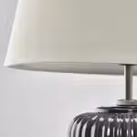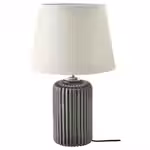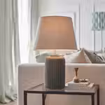Эта настольная лампа с керамическим основанием дает теплый уютный свет, который проникает сквозь серую ткань абажура.