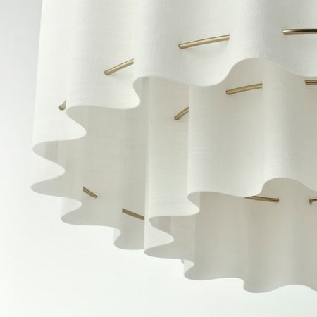 Белый абажур этого напольного светильника, как плиссированная юбка, спускается вниз к трем стройным ножкам из массива бука.