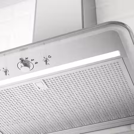 Эта вытяжка из нержавеющей стали с мягкими скруглёнными краями и переключателями в стиле ретро придаёт кухне традиционный вид.
