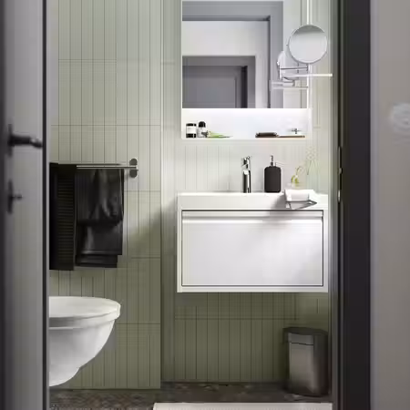 Современный стиль мебели для ванной ЭНГШЁН подчеркивается интегрированными ручками и лаконичным дизайном.
