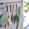 Удобно повесить на крючок рядом с кухонной столешницей.