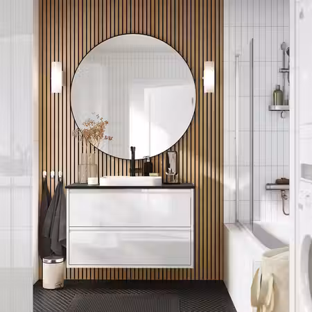 Мебель для ванной ЭНГШЁН выглядит современно и лаконично с минимумом деталей.