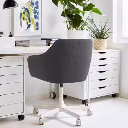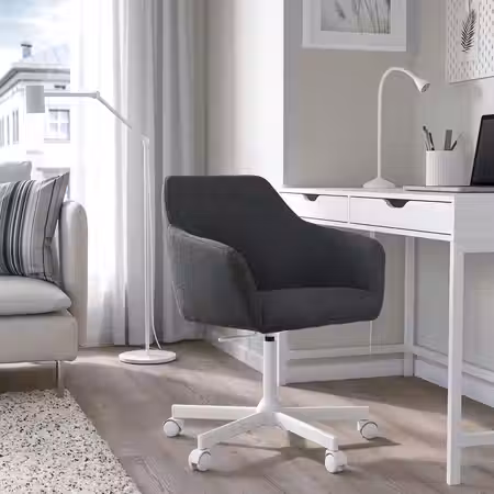 Дизайн этого вращающегося стула отличается плавными линиями и комфортными материалами.