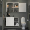 В набор входит: шкаф, подвесное зеркало, ручка, ножка, раковина, сифон, смеситель, крючок и контейнер.