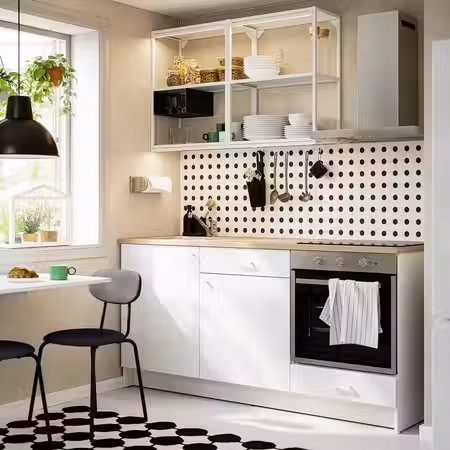 Каркасы МЕТОД — основа вашей новой кухни. Выберите напольные, навесные и высокие шкафы, которые представлены в разных вариантах ширины. Навесные и высокие шкафы также есть разной высоты. Чтобы задействовать углы, установите угловой шкаф с вращающейся секцией, которая обеспечивает удобный доступ к содержимому. Мы также создали несколько каркасов для встраиваемой духовки. Отличное решение, чтобы разместить духовку на удобной высоте. Дополните комбинацию практичными внутренними элементами УТРУСТА И ВАРЬЕРА.