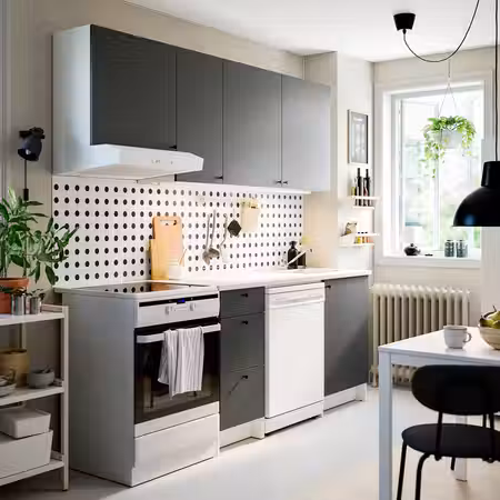 Каркасы МЕТОД — основа вашей новой кухни. Выберите напольные, навесные и высокие шкафы, которые представлены в разных вариантах ширины. Навесные и высокие шкафы также есть разной высоты. Чтобы задействовать углы, установите угловой шкаф с вращающейся секцией, которая обеспечивает удобный доступ к содержимому. Мы также создали несколько каркасов для встраиваемой духовки. Отличное решение, чтобы разместить духовку на удобной высоте. Дополните комбинацию практичными внутренними элементами УТРУСТА И ВАРЬЕРА.