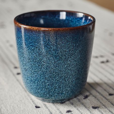 Глазурованная кружка насыщенного синего цвета с золотисто-коричневым ободком станет достойной оправой для любого напитка.