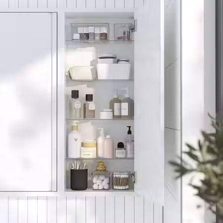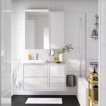 Современный стиль мебели для ванной из серии ÄNGSJÖN подчеркивается интегрированными ручками и лаконичным дизайном.