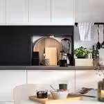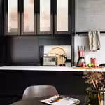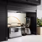 Небольшая бытовая техника спрятана за закрытой дверцей, чтобы на кухне царил порядок.