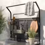 На полках достаточно места для моющих средств, кухонных принадлежностей и посуды.