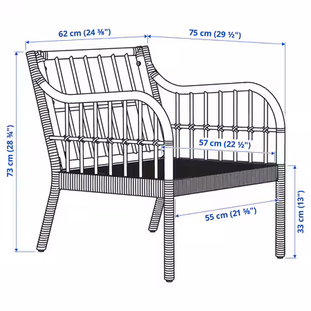 Вручную изготовлено из ротанга, бамбука и дерева — натуральных материалов, придающих каждому креслу уникальность.