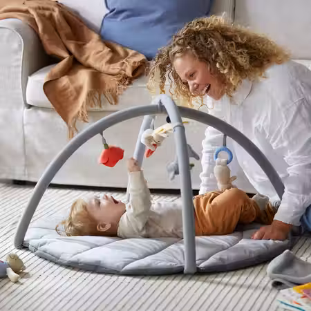 Тренажер для младенцев с забавными фигурками и зеркальцем, в котором малыш сможет видеть собственное отражение.