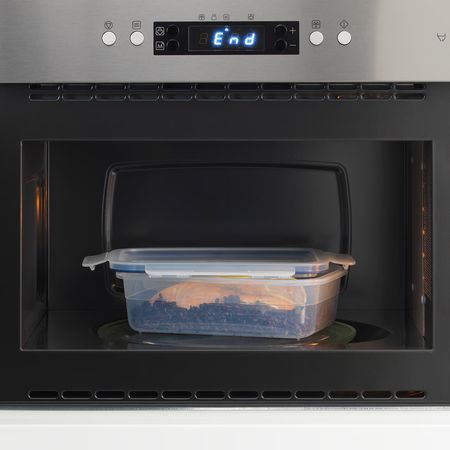 Достать из холодильника и положить в рюкзак, разогреть в СВЧ-печи и отправить в посудомоечную машину.