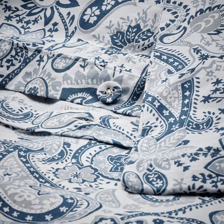 Декоративная застёжка на пуговицах, обтянутых тканью с таким же узором, как и на пододеяльнике, удерживает одеяло внутри.
