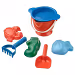 В набор входит: 1 сито, 1 ведерко, 1 лопатка, 1 грабли и 3 формочки для песка.
