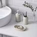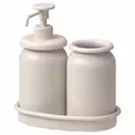 В набор входит: 1 дозатор для жидкого мыла, 340 мл (диам. 7 см, высота 16 см), 1 стакан для зубных щеток (диам. 7 см, высота 11 см) и 1 лоток (длина 16 см, глубина 10 см).