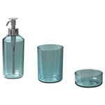 В набор входит: 1 дозатор для жидкого мыла, 340 мл (диам. 7 см, высота 19 см), 1 стакан для зубных щеток (диам. 8 см, высота 10,3 см) и 1 лоток (диам. 8,5 см).