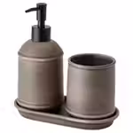 В набор входит: 1 дозатор для жидкого мыла, 400 мл (диам. 8,4 см, высота 18,4 см), 1 стакан для зубных щеток (диам. 8 см, высота 10 см) и 1 лоток (длина 19 см, глубина 9,4 см).