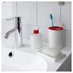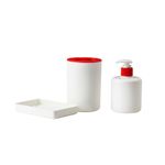В набор входит: держатель для зубных щеток (диам. 8 см, высота 11 см), дозатор для жидкого мыла (диам. 8 см, высота 11 см) и мыльница (12x8x2 см). Контейнер: Полипропилен. Насос: Нержавеющая сталь. Может требоваться специальная обработка отходов.