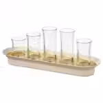 В набор входит: 2 большие вазы (высота 10 см, диам. 4 см), 2 средние вазы (высота 8 см, диам. 4 см) и 1 маленькая ваза (высота 6 см, диам. 4 см).