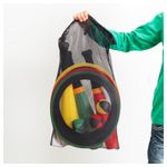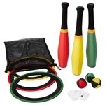 В набор входит: 3 мяча разных цветов, 3 кольца разных цветов, 3 булавы разных цветов и 1 сетка для хранения.